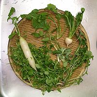 せり、なずな(ぺんぺん草)、ごぎょう、はこべら、ほとけのざ、すずな(かぶ)、すずしろ(大根)・・・ちょっとホロ苦味があって、トロっとしたお粥によく合うわぁ〜七草をあんまりお粥に混ぜ込まず、上にのっけてポン酢をたらすのが我が家流の食べ方。おせち料理を食べ過ぎた胃には、ちょうどいい。