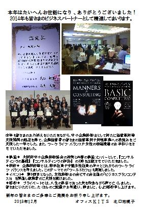 本年はたいへんお世話になり、ありがとうございました! 2013年は、皆さまのお力添えをいただきながら、中小企業診断士として新たに経営革新等支援機関の認定を得て、企業経営者の皆さまの経営革新や新規事業への取組みをご支援した一年でした。また、ワーク・ライフ・バランスや女性の活躍推進のお手伝いをさせていただきました。